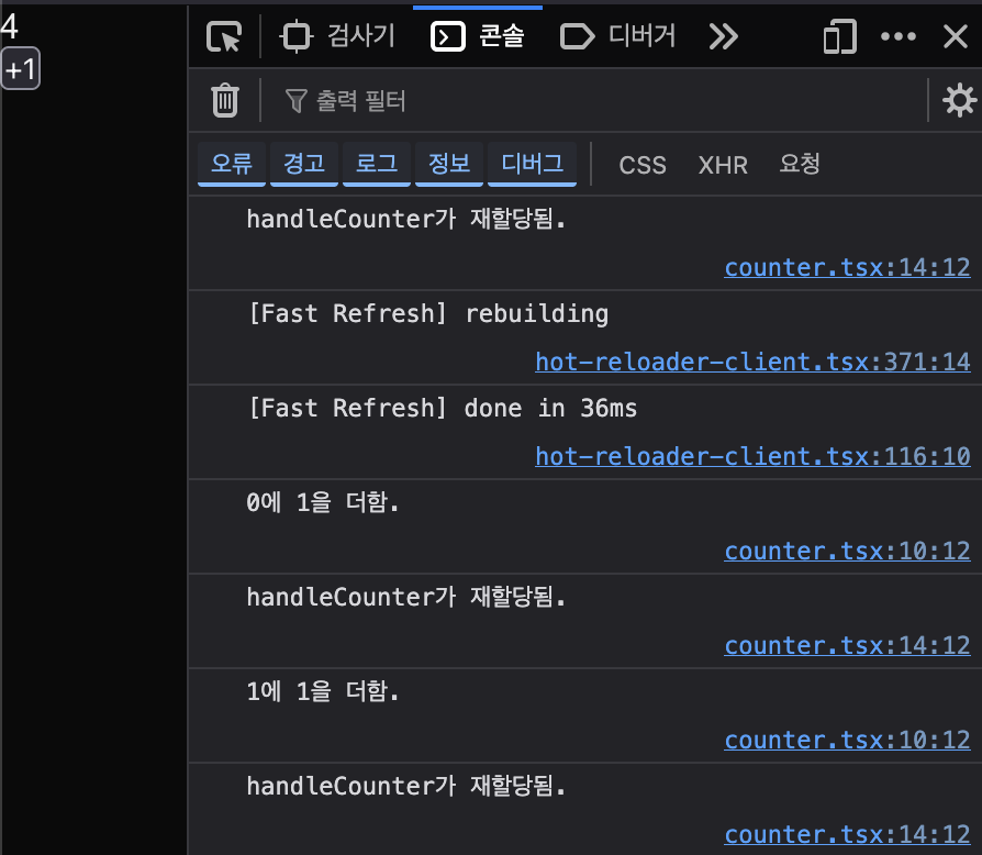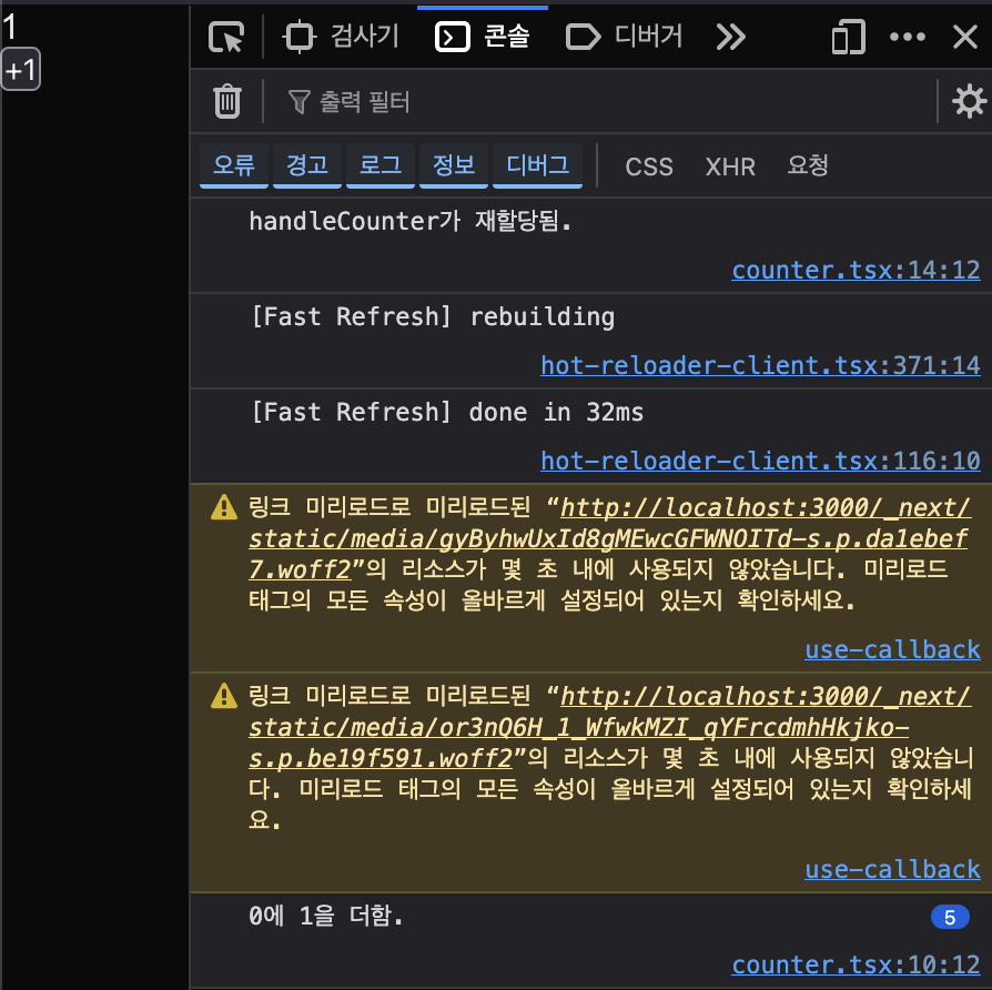 이와 같이 처음에 함수를 한번 할당해주고 +1 버튼을 눌렀을 때 함수가 메모이제이션 되어 값이 변화하지 않는 것을 알 수 있다.